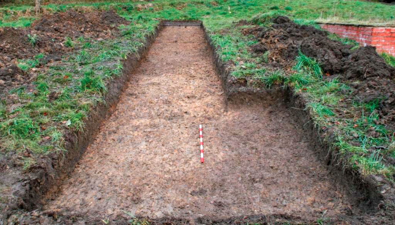 Four trenches (1–4) were machine-excavated across the site. Trenches 1 and 4 were placed in the pasture to the south, while Trenches 2 and 3 were located in the house’s garden. All trenches encountered natural boulder clay at their base: