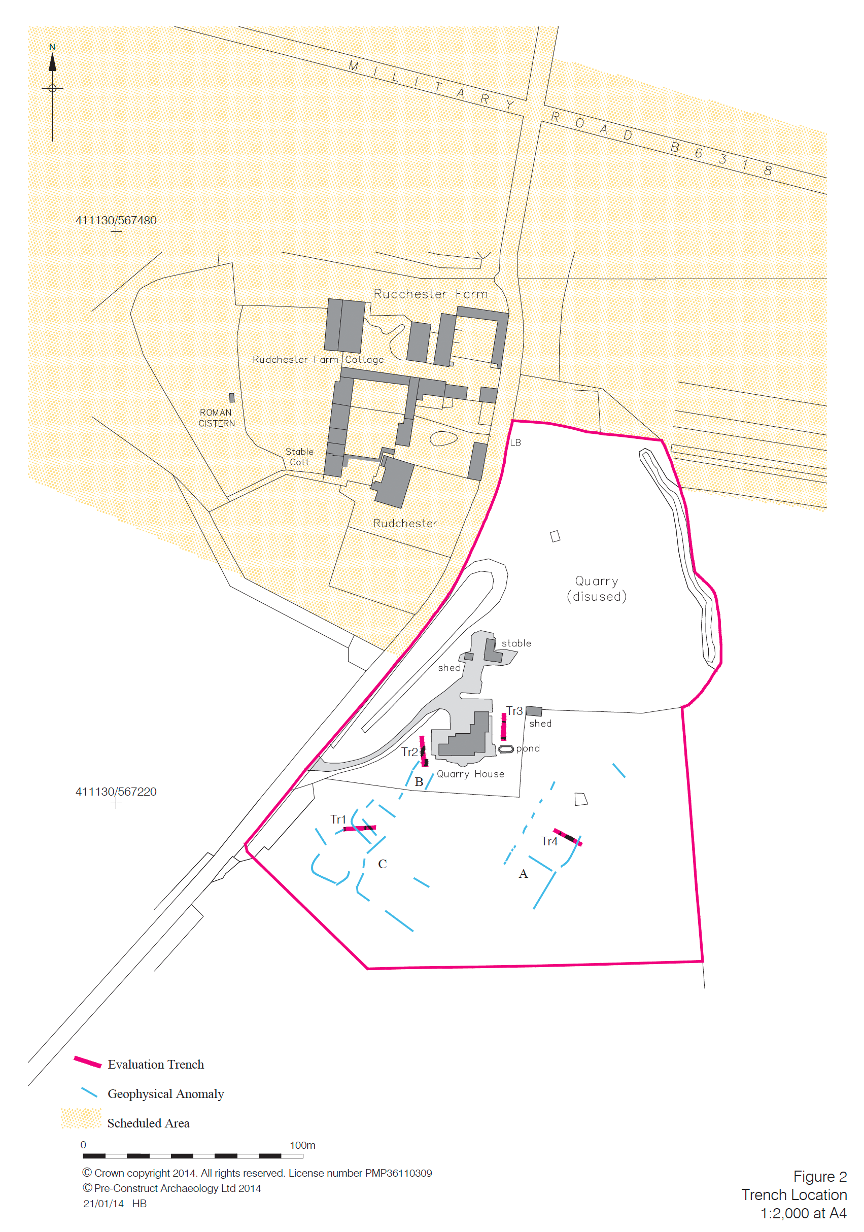 In December 2013, Pre-Construct Archaeology undertook a trial trench evaluation at Quarry House, Rudchester, near Heddon-on-the-Wall, Northumberland. The investigation was commissioned to support a planning application for the redevelopment of the property, which lies within the buffer zone of the Hadrian’s Wall World Heritage Site and near the scheduled Roman fort of Vindobala and its associated civilian settlement (vicus).